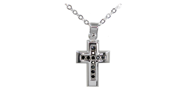 White gold diamond cross featuring brilliant cut black diamonds grain set with polished outer edges with bail. Chain sold separately.