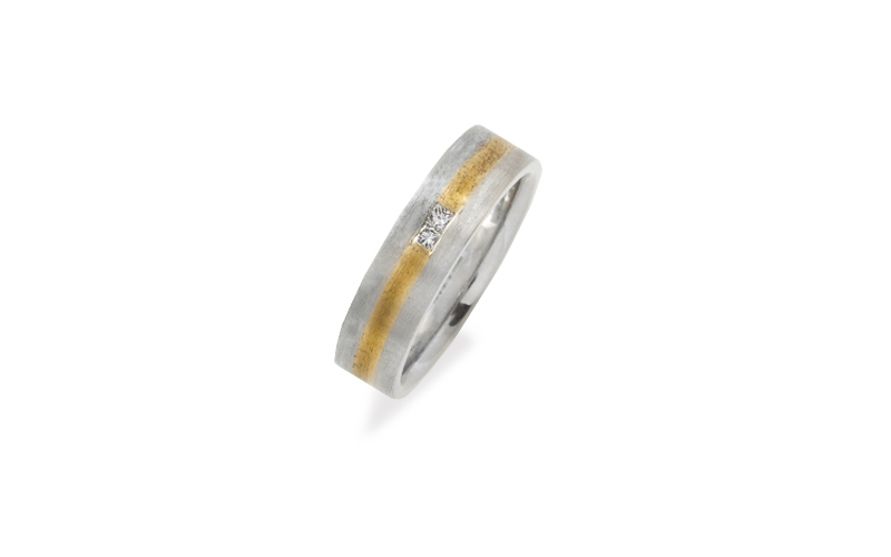 SKU: 2663318ct solid two tone mens diamond ring featuring two princess cut diamonds channel set on a wide brushed band finish.